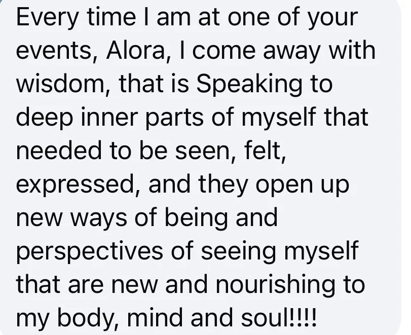 ALORA’S PRESENCE INSPIRES WOMEN TO DROP THEIR DEFENSES AND DISCOVER A DEEPER KNOWING; THEIR BODIES ARE THE MOST INTELLIGENT LEADERS THEY’LL EVER MEET, AND IT IS SAFE TO FINALLY TRUST THEM.